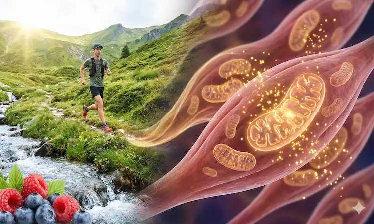 Side-by-side image of a trail runner outdoors and antioxidant-rich berries, paired with glowing mitochondria inside muscle cells, showing how to boost mitochondria naturally for more energy.