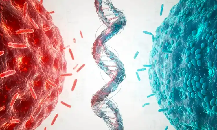 Illustration of a DNA strand at the center, flanked by a red sphere symbolizing bacteria on the left and a blue sphere representing cells on the right. Energetic and scientific.